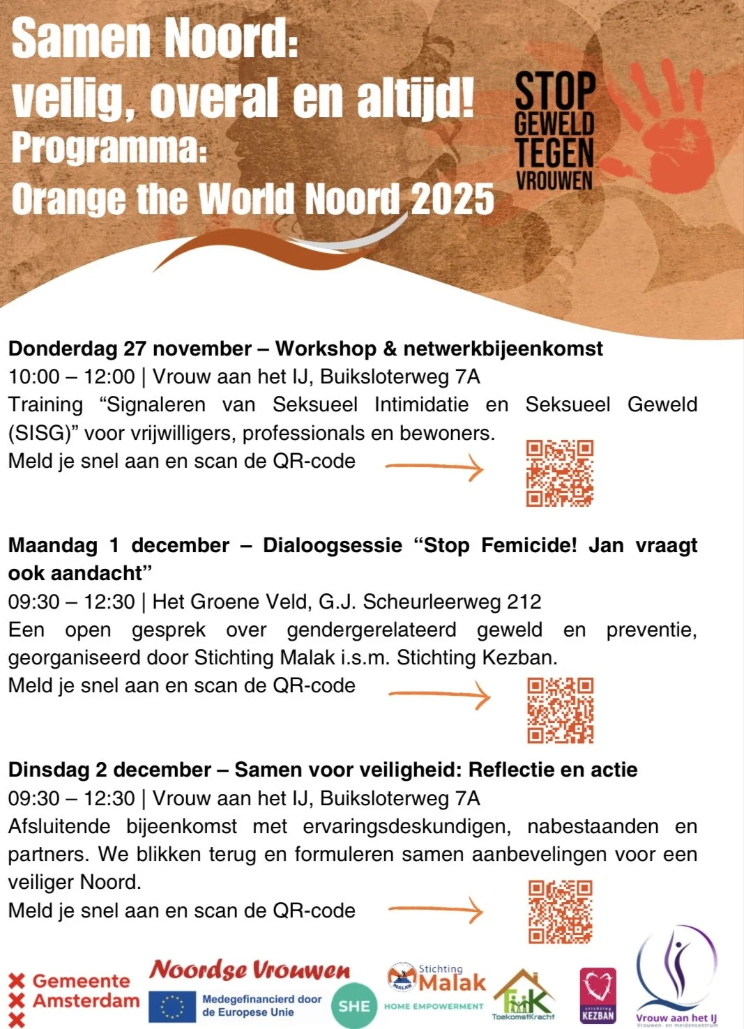 Met vier bijeenkomsten vol dialoog, training, ontmoeting en reflectie kleuren we Noord oranje, de kleur van hoop, solidariteit en een toekomst zonder geweld tegen vrouwen (zie flyers). Het programma is een samenwerking van Stadsdeel Noord, Vrouw aan het IJ, Stichting Malak, Stichting Home Empowerment (SHE) en Noordse Vrouwen / Civic Amsterdam.