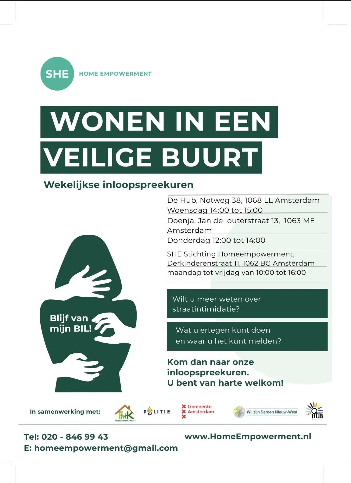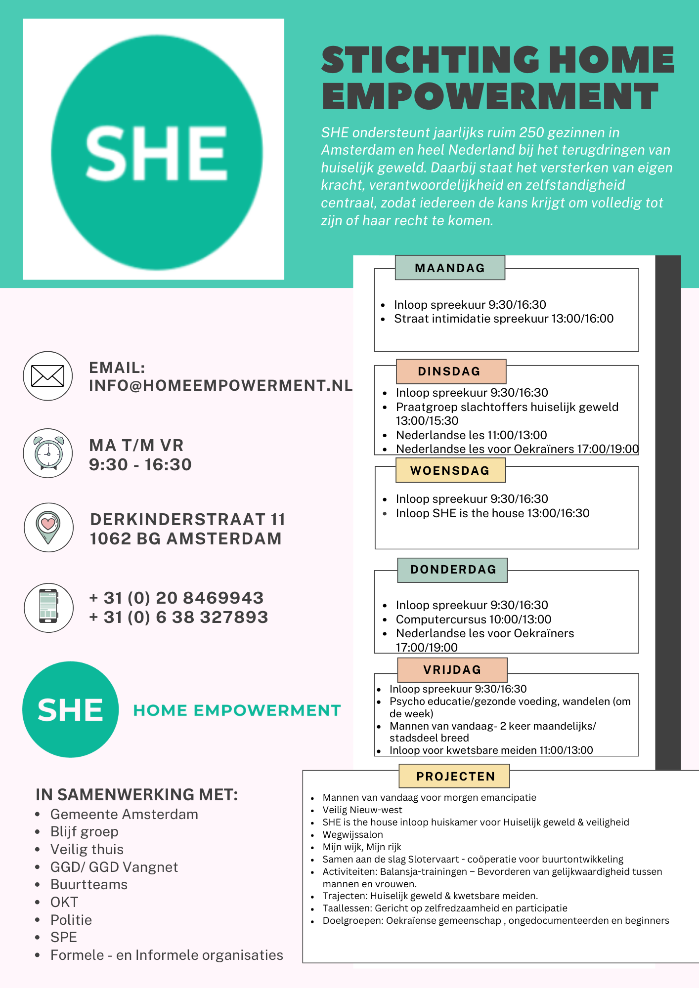 SHE biedt ondersteuning voor iedereen, zonder drempels of wachtlijsten. SHE ondersteunt jaarlijks ruim 250 gezinnen in Amsterdam en heel Nederland bij het terugdringen van huiselijk geweld. Bekijk de projecten, de agenda en de wekelijkse inloopspreekuren op bovenstaande flyer.